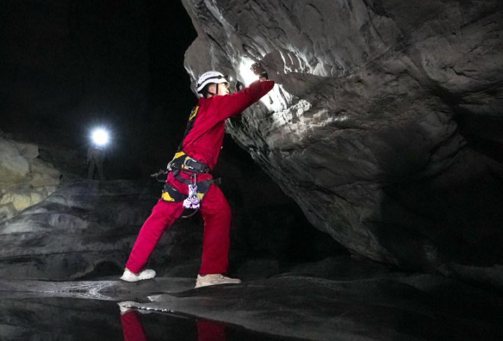 深入洞穴腹地,上游新闻记者与探险队员们一同体验了一把航天员同款“闯关”:90度垂直绳降,身体贴着岩壁凌空而下;沿崖壁钢索前行,脚下是望不见底的暗河;涉水通行,漫过胸口的暗河水,带来的不仅是刺骨的寒冷,还有对水下未知的恐惧。
